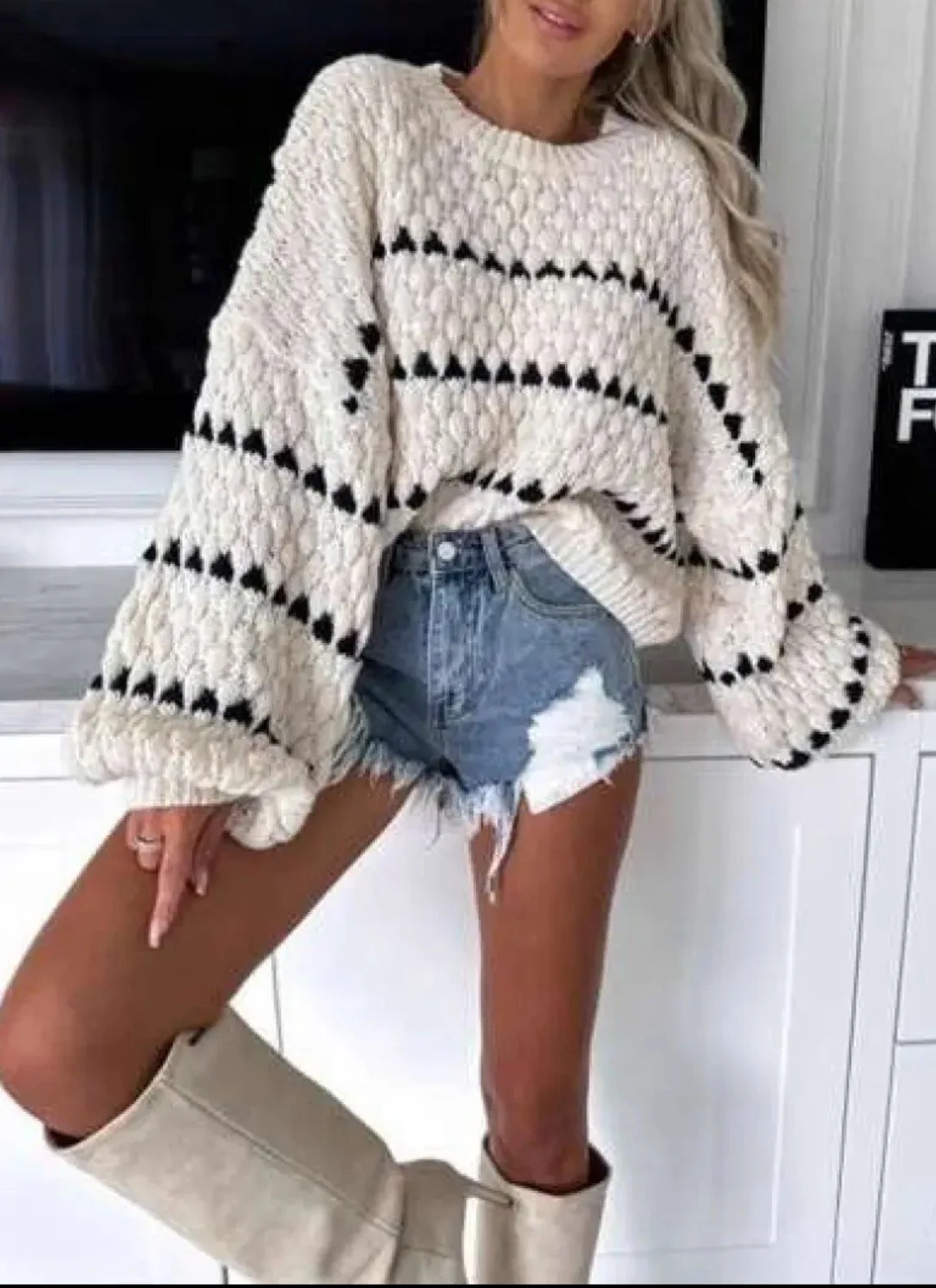 This oversize stripe sweater is a one size fit all. The sweater stops at the waistline, round neck, and has balloon sleeves.
